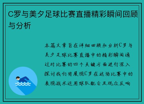 2025-08-12 15:59:31在足球历史的长河中,C罗与梅西的巅峰对决无疑是最引人注目的篇章之一。两位巨星在赛场上的每一次交锋,都是技术、智慧和毅力的较量。本文将从四个方面详细回顾和分析他们之间的经典比赛瞬间,包括比赛中的战术变化、个人技术表现、心理博弈以及对球队的影响。通过这些分析,我们将更深入地理解这两位传奇球员如何在激烈的...