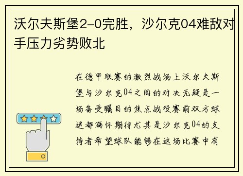 沃尔夫斯堡2-0完胜,沙尔克04难敌对手压力劣势败北