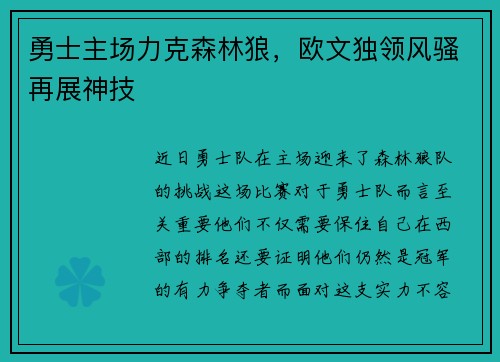 勇士主场力克森林狼,欧文独领风骚再展神技