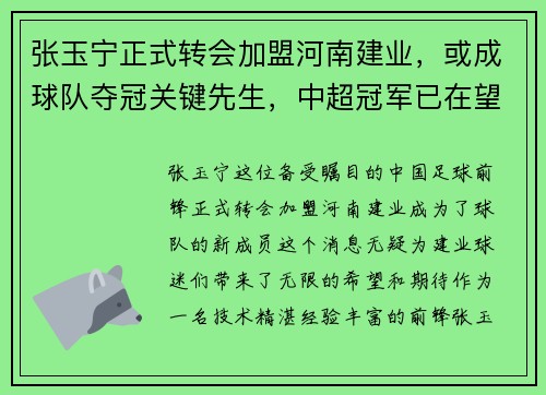 张玉宁正式转会加盟河南建业,或成球队夺冠关键先生,中超冠军已在望?